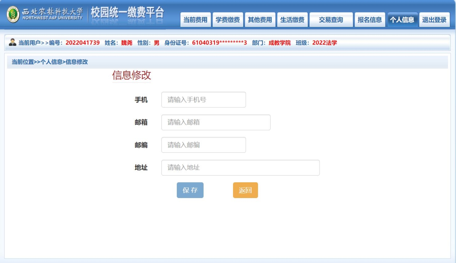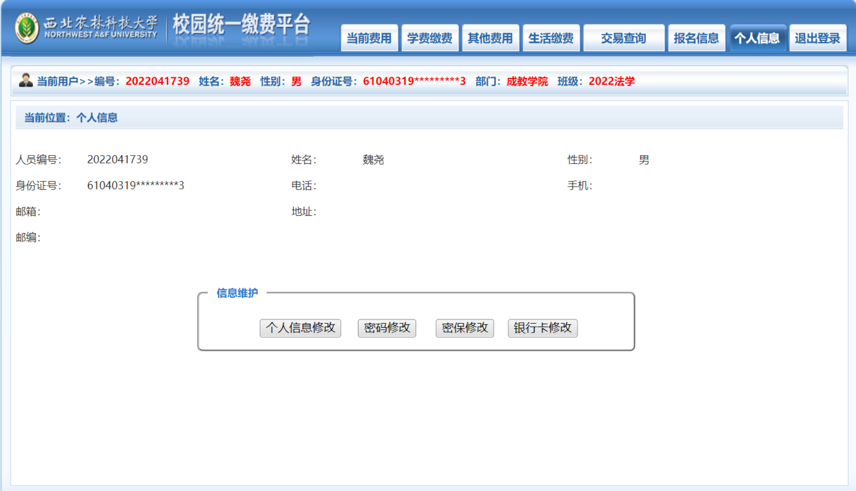 缴费平台:西北农林科技大学校园统一缴费平台
