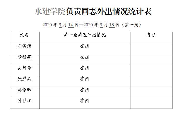 » 水建学院负责同志外出情况统计表(第一周)
