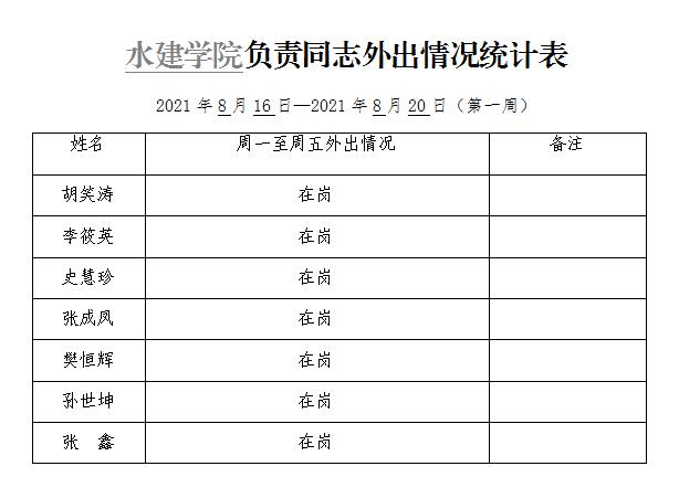 水建学院负责同志外出情况统计表(第一周)