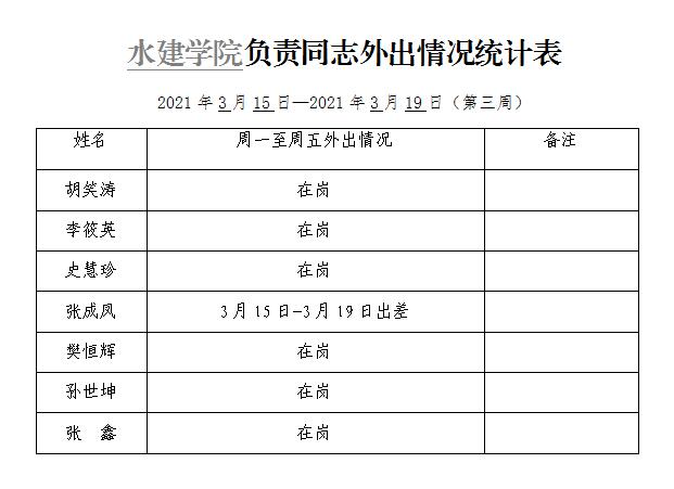 水建学院负责同志外出情况统计表(第三周)