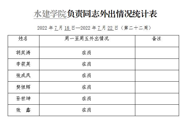 » 水建学院负责同志外出情况统计表(第二十二周)
