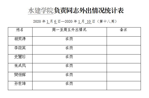 » 水建学院负责同志外出情况统计表(第十八周)