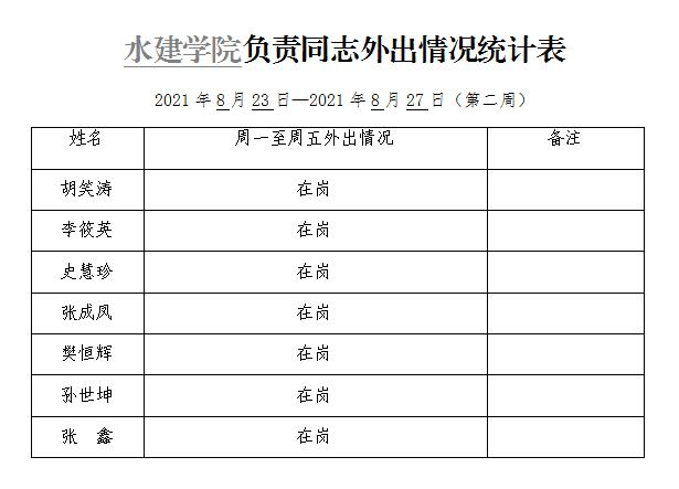 水建学院负责同志外出情况统计表(第二周)
