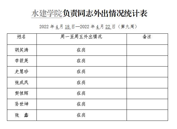 » 水建学院负责同志外出情况统计表(第九周)