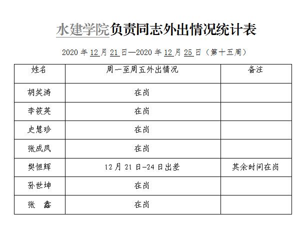 » 水建学院负责同志外出情况统计表(第十五周)