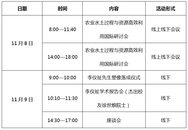 届时将举办由校友捐款完成的李仪祉先生半身青铜塑像落成仪式、召开座谈会、举办李仪祉论坛院士校友报告会、国际学术研讨会等多种形式纪念先生,缅怀先生为我国水利事业做出的伟大贡献,学习先生爱国爱民、崇尚科学、德高学泰、业精功伟的高尚情操,感悟先生丰富深刻的水利思想、崇高的民族气节和卓越的治水精神,弘扬他崇尚民族、热爱祖国、开创教育的科学情怀,以及他为中国水利奋斗终生,无私奉献的英雄气魄。