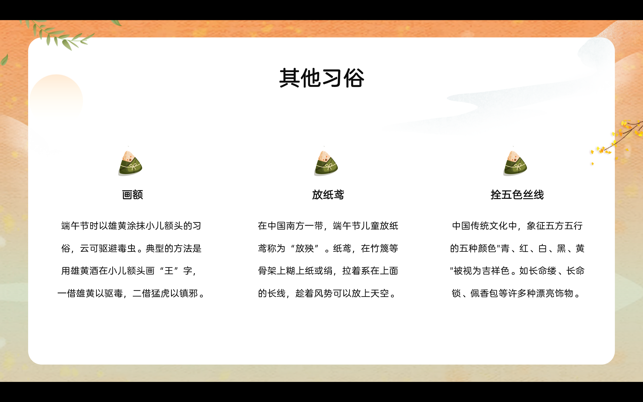 中国传统节日文化体现了中华民族的价值理念。端午节就体现了中华民族追求和谐的理念。随着网络时代的来临,信息的爆炸化,让大部分青少年很少去关注中国的传统文化。弘扬传统文化,能让同学们从理解传统文化到主动去继承去发展,让中国传统文化愈久弥新,源远流长。