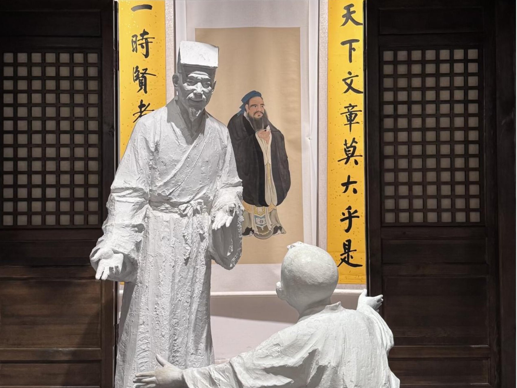 图为孔子博物馆中的孔子画像和古人传道授业的场景