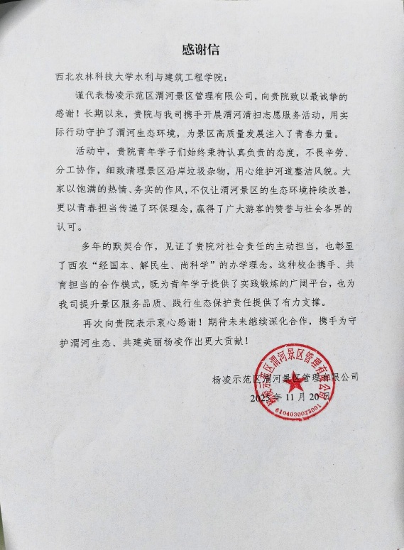 杨凌示范区渭河景区管理有限公司在感谢信中表示,此次活动既美化了渭河环境,又推动了校企合作、共育担当的合作模式,并增强了同学们保护生态环境的意识。