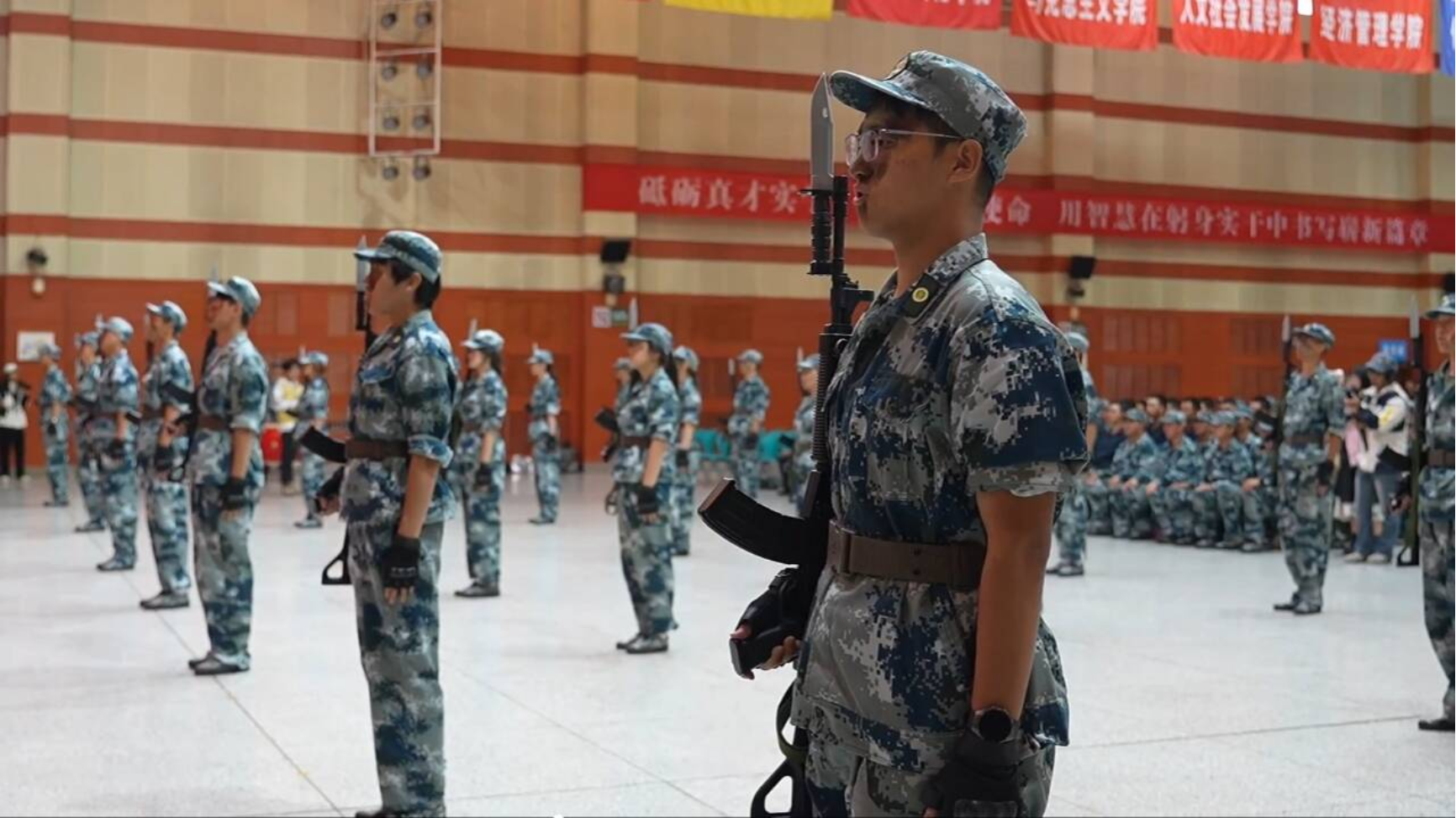 会议伊始,雄壮的国歌在会场响起,全体参会人员肃立致敬。随后,军事技能汇演正式开始,我院两个新生方阵压轴亮相,身着迷彩服的同学们身姿挺拔,斗志昂扬,匕首操动作迅速敏捷,刺杀操用枪刚劲有力,每一个招式都展现出严谨的作风,充分彰显了水建学子良好的训练成果和精神风貌。