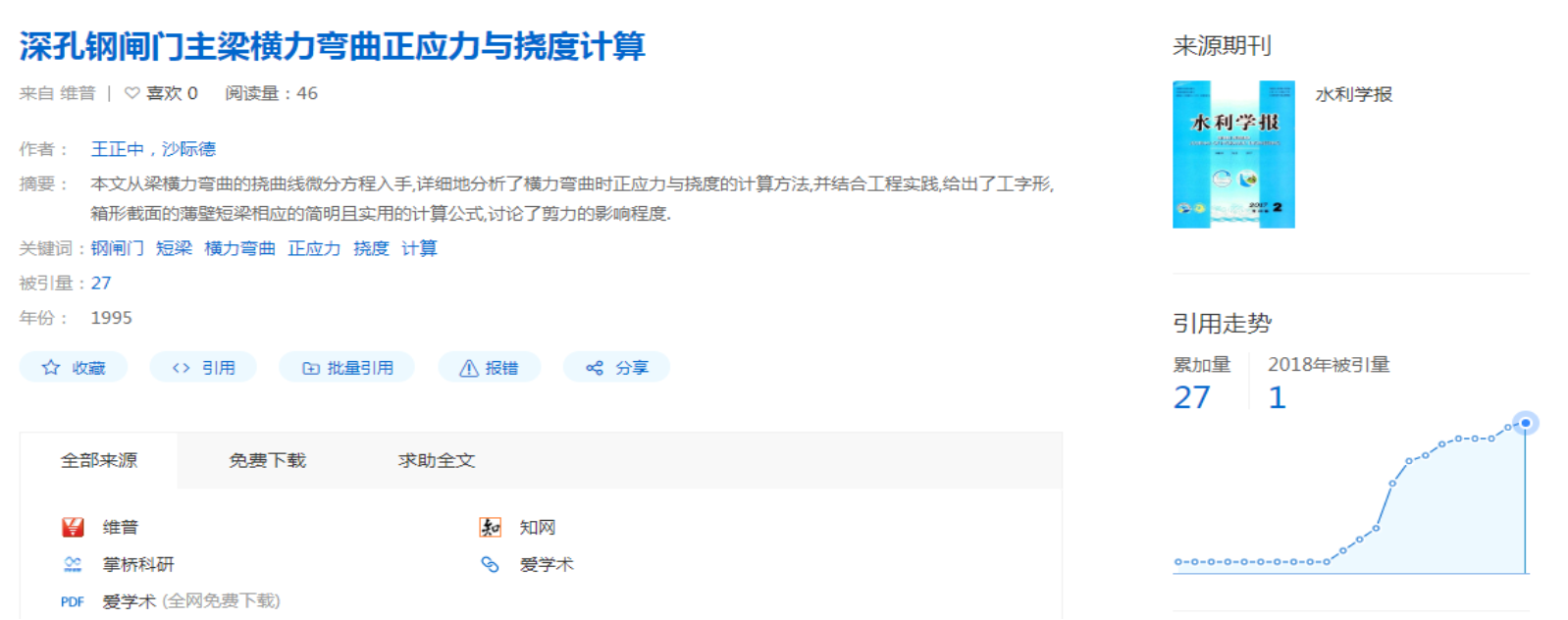 我国高坝大库建设水平世界一流,高水头水工结构安全是制约水利水电工程发展的瓶颈,对此关键力学问题王正中教授1995年已完成系统理论研究,并在《水利学报》发表了“深孔钢闸门主梁横力弯曲正应力与挠度计算”论文(图1),该成果25年后被纳入最新《水利水电工程钢闸门设计规范》(SL 74-2019)规范。