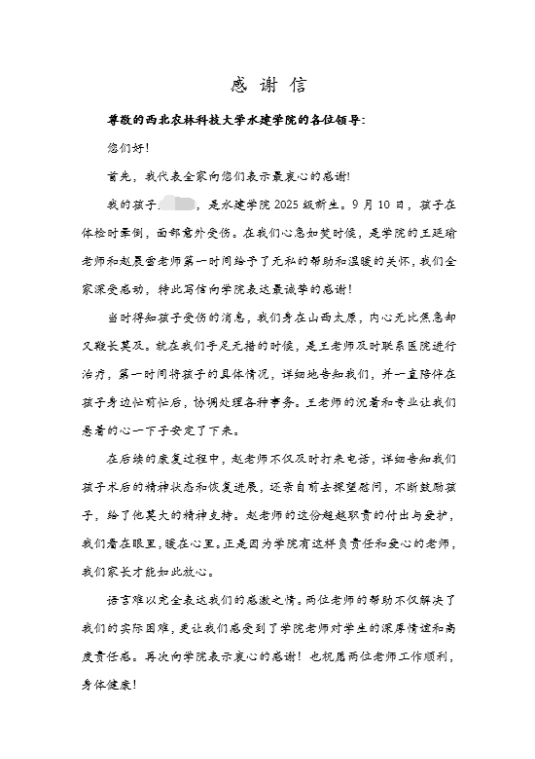 桃李不言,下自成蹊。受伤学生的父母从电话里了解到事情经过后,特意定制了绣着“温情关怀润桃李 高尚师德映杏坛”的锦旗,从太原跨越五百多公里送到学校。学生家长握着王延瑜和赵晨雪的手激动地说:“把孩子交给这样的老师,我们一千个放心!”锦旗的流苏在秋风中轻扬,映照着家长湿润的眼眶。随后,学院也收到了来自学生家长的深情感谢信。信中写道:“在我们心急如焚的时候,是学院的王延瑜老师和赵晨雪老师第一时间给予了无私的帮助和温暖的关怀……王老师的沉着和专业让我们悬着的心一下子安定了下来;赵老师不仅及时告知孩子术后的恢复进展,还不断鼓励孩子,给了他莫大的精神支持。这份超越职责的付出与爱护,我们看在眼里,暖在心里。”