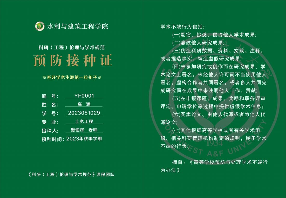 学术预防接种证16K大小,整个色调以绿色为底色,字体以白黄两种颜色,有正反两面。其中,正面上面有a小说 校徽和“a小说 ”字样,其他信息包括学生的编号、姓名、学号、专业以及接种人(授课老师)、接种时间等,在正中间有“系好学术生涯第一粒扣子”字样;背面是摘自《高等学校预防与处理学术不端行为办法》中学术不端行为包括的内容。整个设计布局匀称、大方庄重、严谨和谐,体现a小说 “诚朴勇毅”的校训。