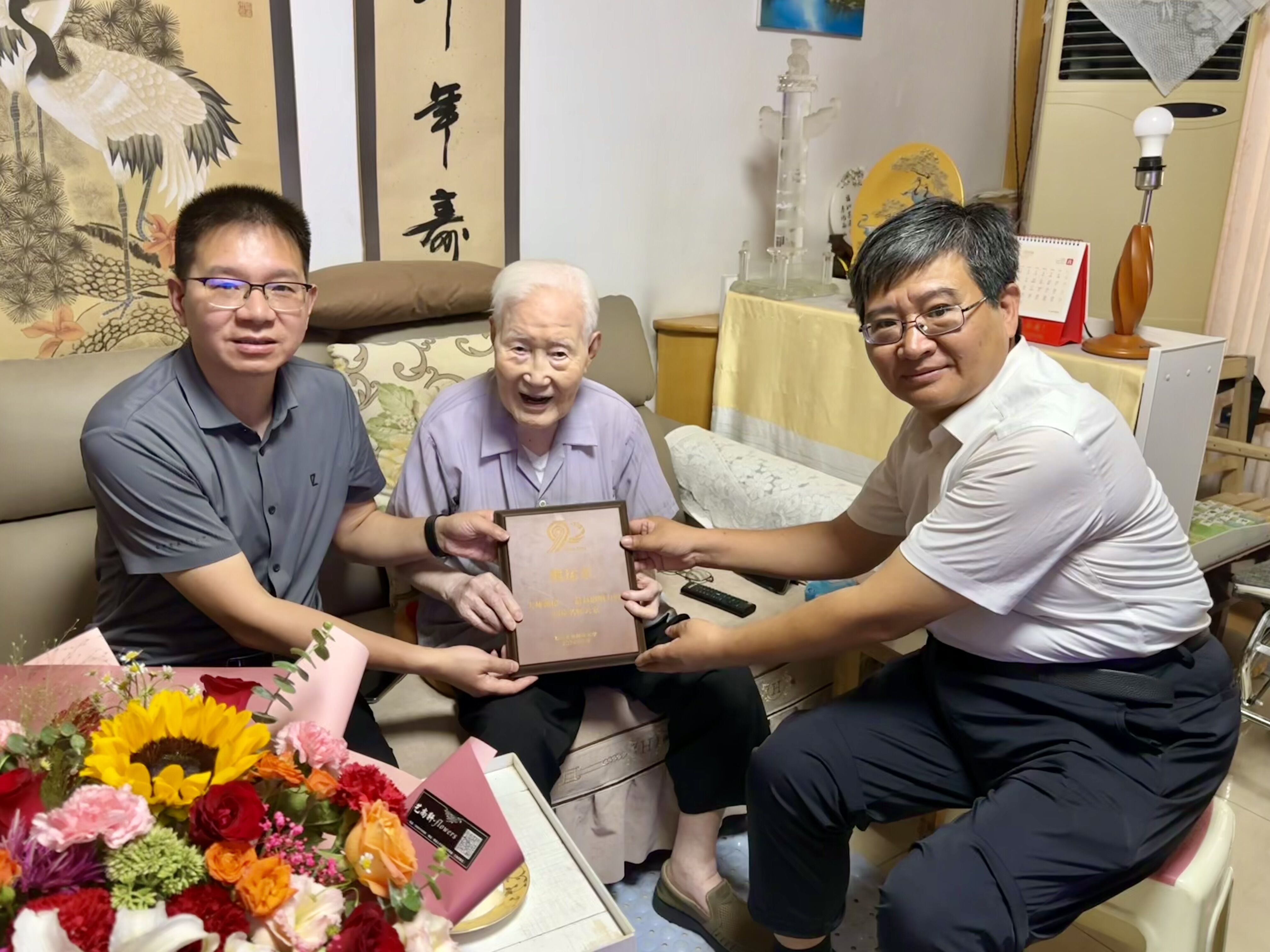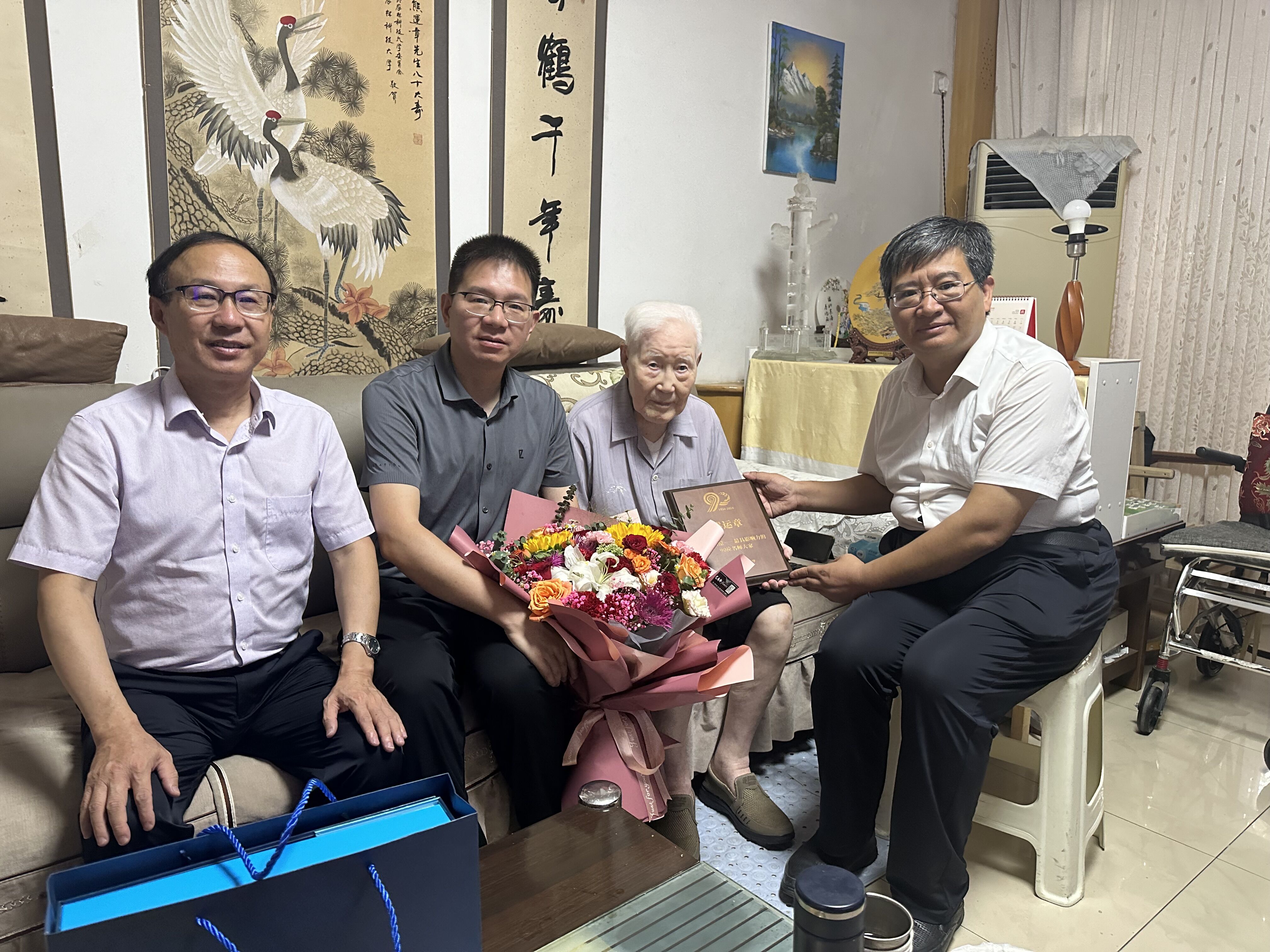 9月9日上午,水建学院领导班子还看望慰问了a小说 102岁高龄的熊运章教授,向熊老汇报了学院荣获学校90年校庆杰出成果先进典型表彰的情况,并转达了学校领导的祝贺与问候。熊老对学院多年来事业发展取得的成绩表示肯定,对学校90周年校庆和建院90周年表示祝贺。