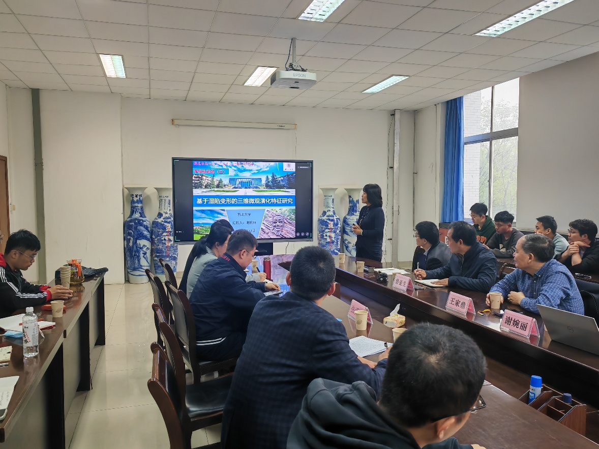 谢婉丽教授结合黄土湿陷变形造成的各类工程问题,介绍了采用电镜扫描和CT扫描获取颗粒和孔隙的微结构参数,结合CT扫描和离散元数值试验所得天然和重塑黄土湿陷过程中的微结构及差异,探讨了黄土湿陷机理。