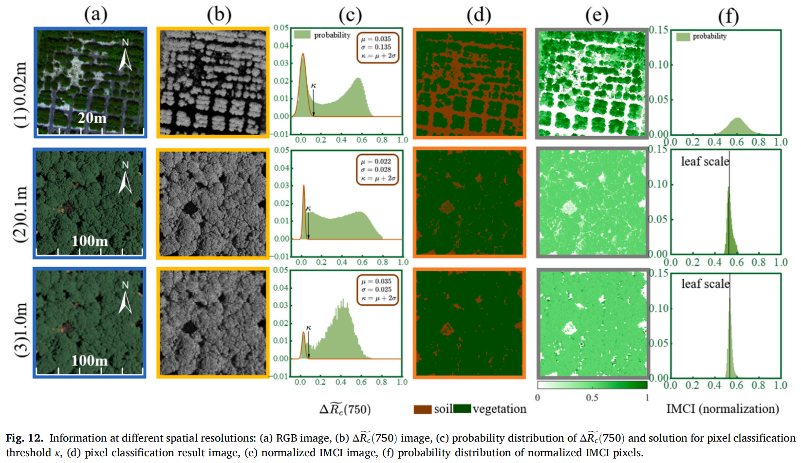 研究介绍了开发 IMCI 的核心步骤:首先,利用植被在598nm与 694nm 处反射率近似相等而土壤反射率不同的特性,并结合土壤在 590-750nm 波段近线性谱形,对冠层顶层反射中的土壤单次散射项进行估计与校正,获得土壤校正后的冠层光谱;其次,利用红边近线性几何特征构建植被单次散射代理量,形成IMCI基本表达式;最后,建立 IMCI与红边位移的定量关系,从机理层面解释了其对叶绿素变化的敏感性。