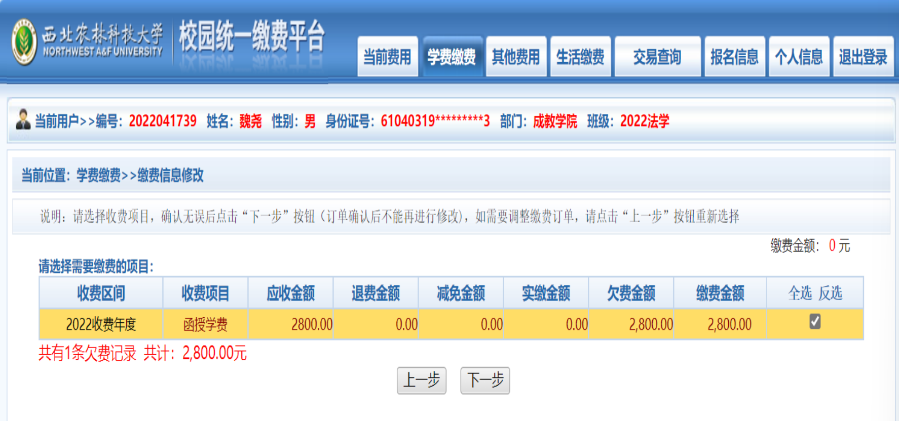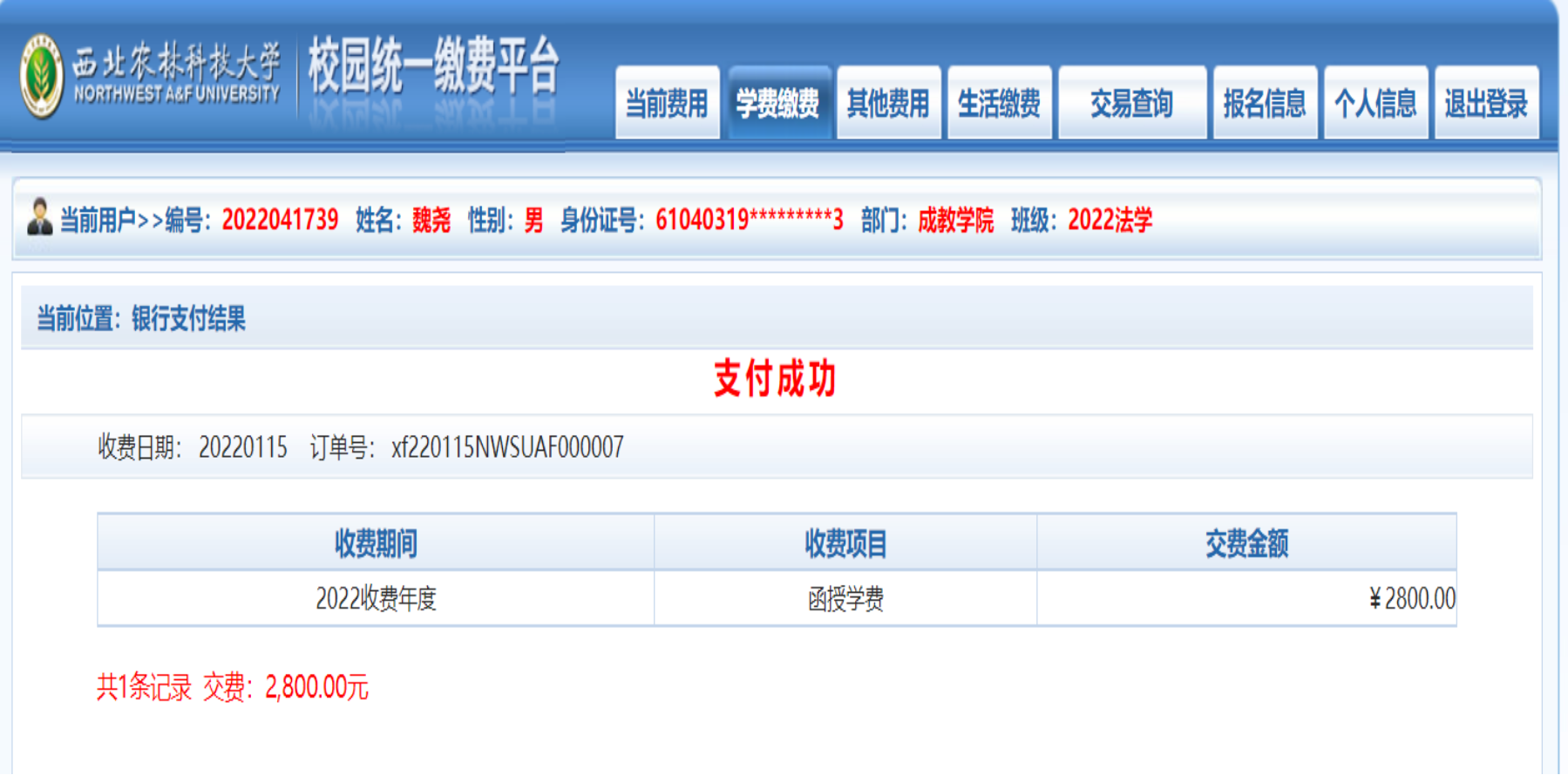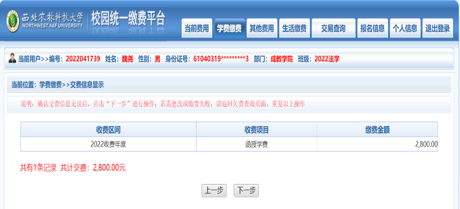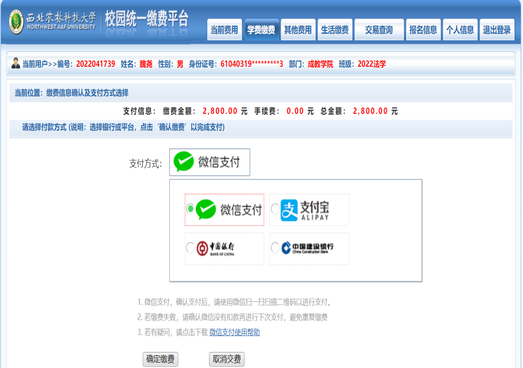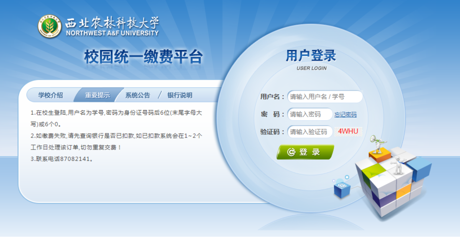 缴费平台:西北农林科技大学校园统一缴费平台