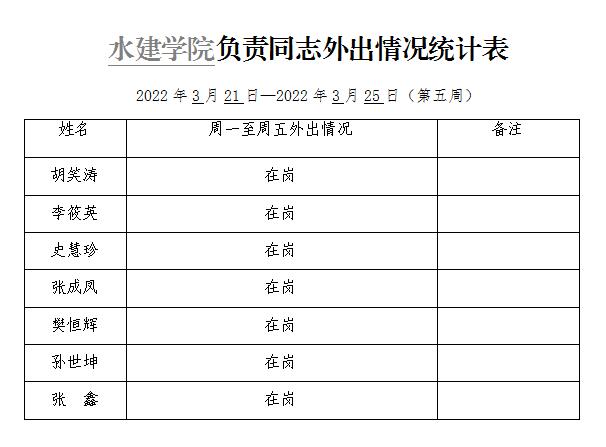 水建学院负责同志外出情况统计表(第五周)