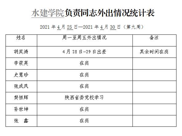 » 水建学院负责同志外出情况统计表(第九周)