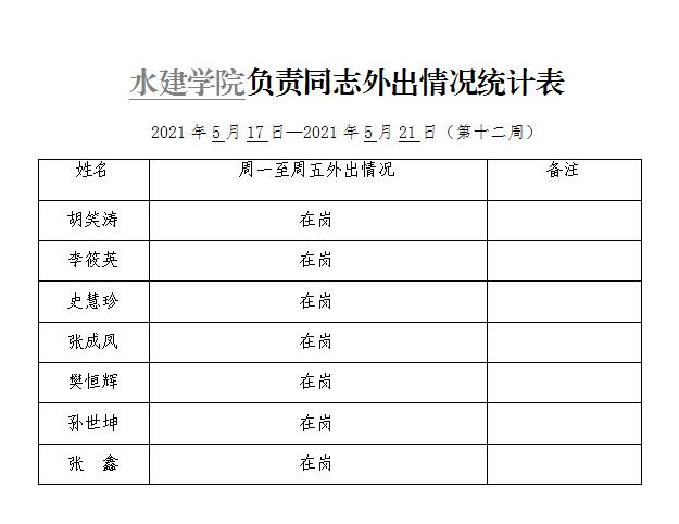 » 水建学院负责同志外出情况统计表(第十二周)