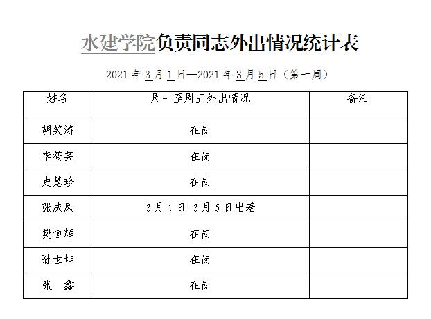 » 水建学院负责同志外出情况统计表(第一周)