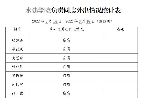 » 水建学院负责同志外出情况统计表(第四周)