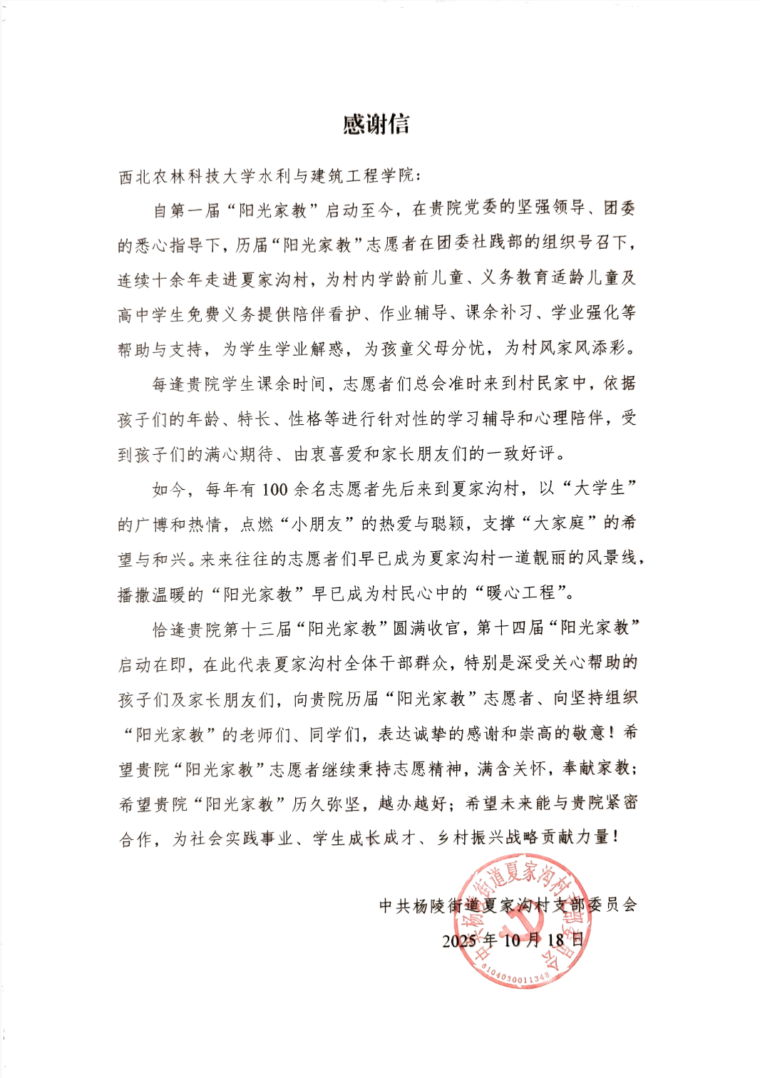 协商过程中,村委会特地向我院开具了感谢信,信中着重提及,过去十三年里,“阳光家教” 公益项目持续为夏家沟的孩子们提供免费辅导,为学生学业解惑,为孩童父母分忧,为村风家风添彩,播撒温暖的“阳光家教”早已成为村民心中的“暖心工程”,以此真挚感谢项目十三年来的陪伴与付出。
