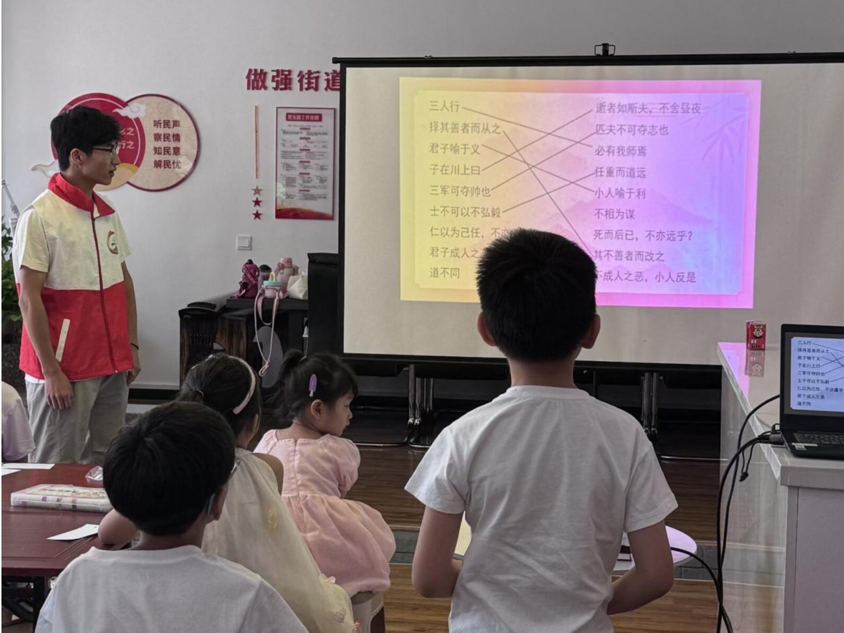 离开孔子博物馆后,实践队成员来到了圣水苑南门党群网格服务站,与社区的孩子们开展了一场生动的儒家文化互动活动。队员们选取《论语》中浅显易懂的经典名句,用讲故事、举例子的方式进行讲解,并通过趣味提问引导孩子们参与互动。活动中,孩子们积极举手回答问题,在轻松愉快的氛围中播下儒家文化的种子。