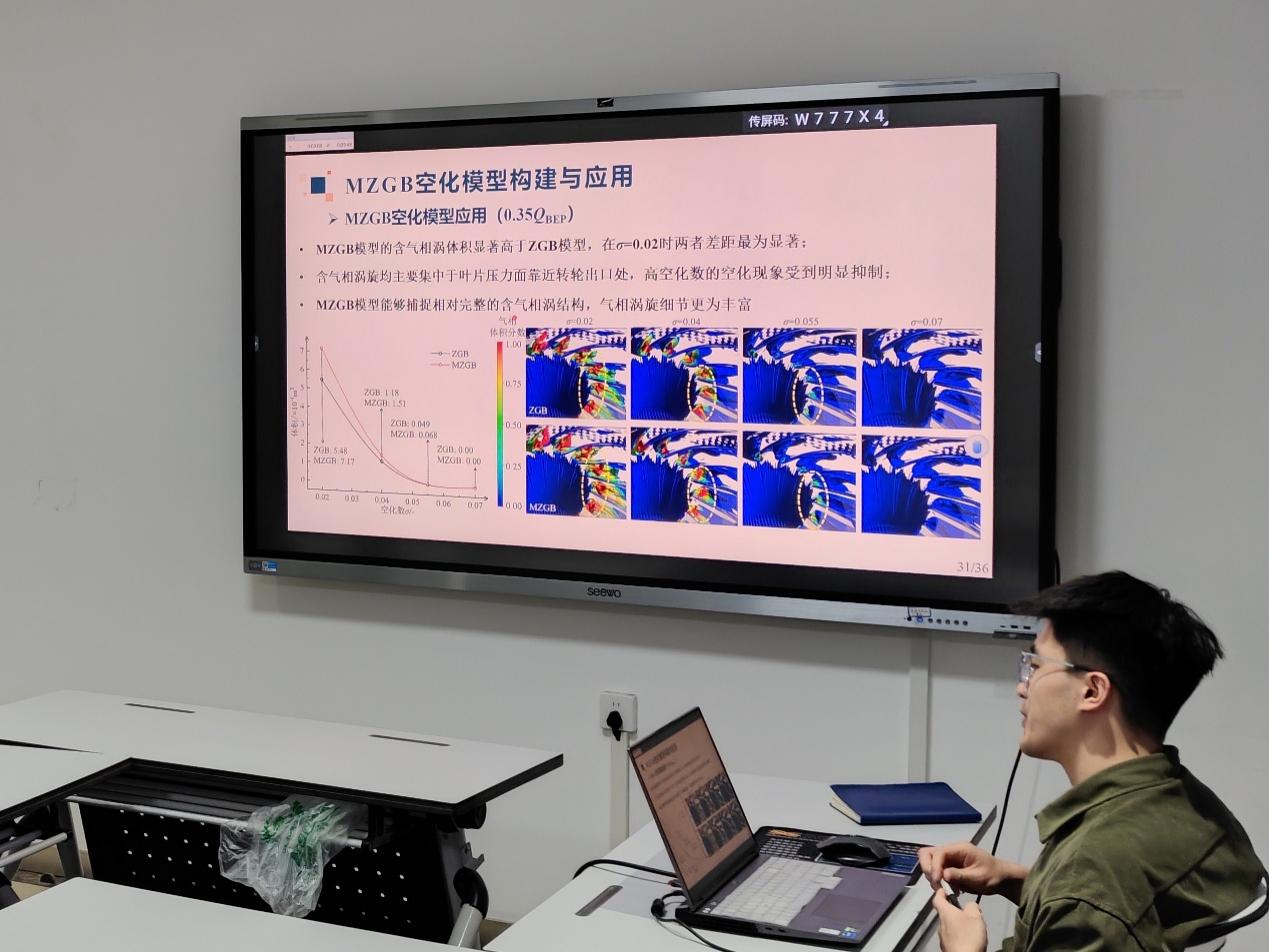 会议上,种鹏举同学围绕“基于MPANS湍流模型的混流式水轮机内流瞬态特性研究”作出专题汇报。该研究以高精度数值模拟为核心,深入分析混流式水轮机在瞬态工况下的内部流动变化规律,为水电设备运行的安全性与高效性提供理论支撑。汇报中,种鹏举同学MPANS湍流模型,对无叶区流态、MZGB空化模型在不同工况下的应用进行了详细模拟和分析。相较传统RANS模型,MPANS在保留平均流特征的同时,能更好地捕捉关键瞬态流动结构,提高了模拟的精度与稳定性。