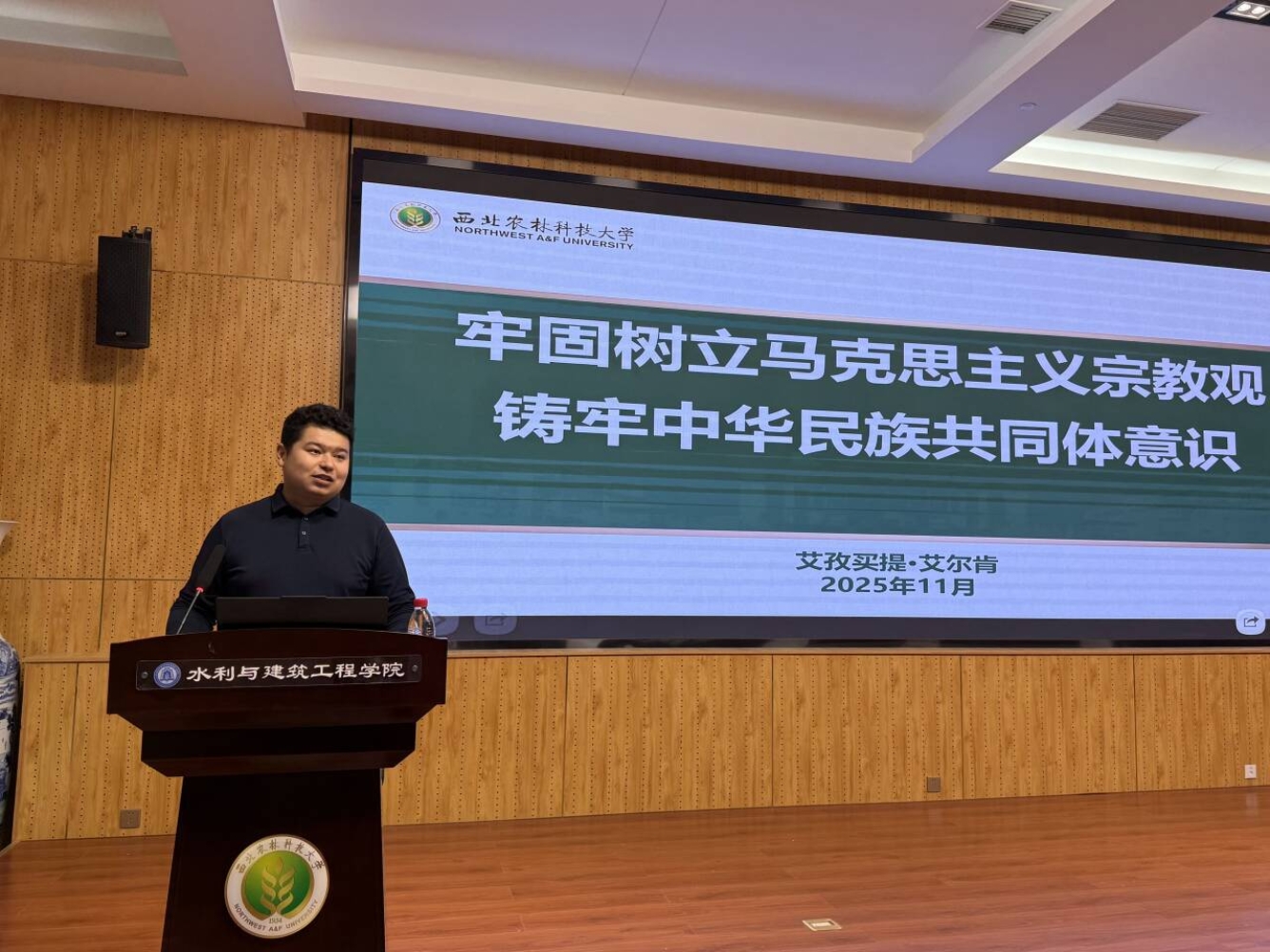 为全面贯彻中国共产党关于加强和改进民族工作的重要思想,坚持以铸牢中华民族共同体意识为主线,不断推进民族团结进步事业,11月6日晚,水利与建筑工程学院开展“牢固树立马克思主义宗教观,铸牢中华民族共同体意识”主题团课。后勤管理服务处办公室主任艾孜买提•艾尔肯老师展开课程讲解。学院2025级各团支部支委、院青马工程学员、入党积极分子、入团积极分子共同参与本次团课。