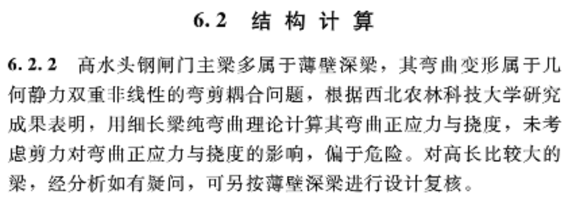 《水利水电工程钢闸门设计规范》(SL 74-2019)第6章结构计算的条文6.2.2中载明:“对高水头闸门主梁如有必要可按薄壁深梁理论校核”。在规范条文说明(规范第144页,见图2)6.2.2中阐述了理论依据及重要性,并载明“高水头钢闸门主梁多属于薄壁深梁,其弯曲变形属于几何静力双重非线性的弯剪耦合问题,根据西北农林科技大学研究成果表明,用细长梁纯弯曲理论计算其弯曲正应力与挠度,未考虑剪力对弯曲正应力与挠度的影响,偏于危险。对高长比较大的梁,经分析如有疑问,可另按薄壁深梁进行设计复核”。